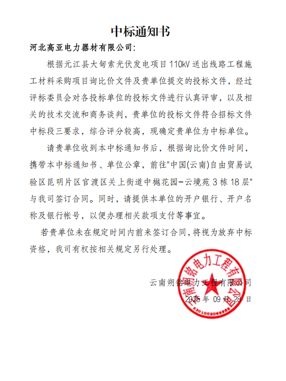 中标通知书——河北高亚电力器材有限公司