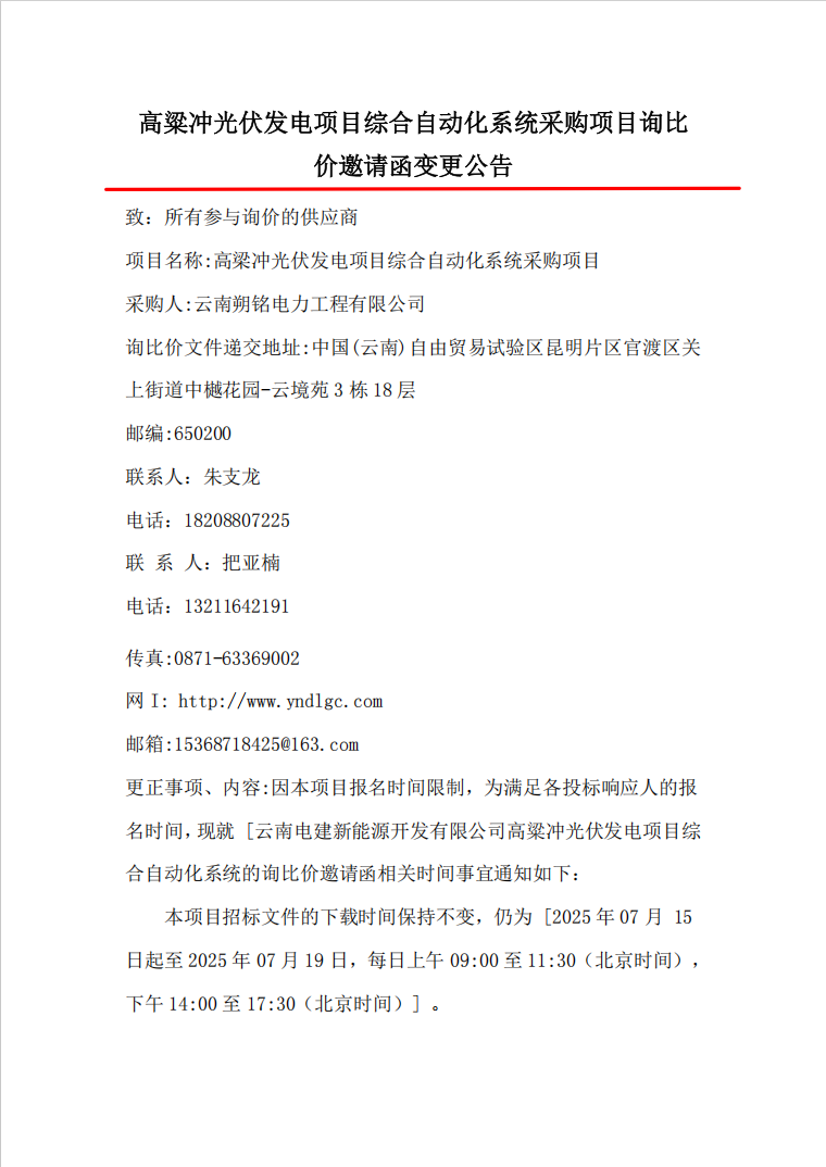 高粱冲光伏发电项目综合自动化系统项目询比价邀请函变更公告