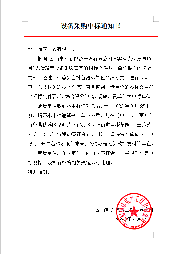 云南电建新能源开发有限公司高梁冲光伏发电项目光伏箱变设备中标公告
